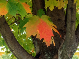 Цвет листьев переходит от темно-зеленого к ярко-красному.